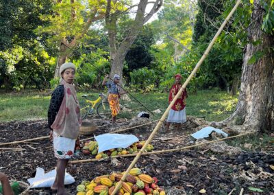 De cacaobonen groeien in een rijke omgeving tussen de pepers, pinda’s, koffie en natuurlijk vanille. Alles bij de Bejofo Estate wordt binnen de eigen organisatie gedaan, het groeien, fermenteren en drogen gebeurt op hun eigen land.