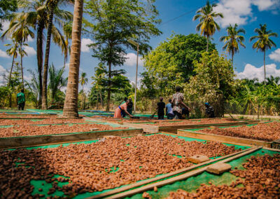Kokoa Kamili fermenteert de bonen door ze zes dagen lang in houten boxen te leggen, afgedekt met bananenbladeren. Kokoa Kamili werkt daarnaast samen met chocolademakers die de bonen op andere manieren fermenteren, om hun eigen unieke smaak te creëren. Wie weet kunnen wij in de toekomst ook op deze manier samenwerken met Kokoa Kamili! Na het fermenteren, worden de bonen vier tot tien dagen gedroogd (afhankelijk van het weer).