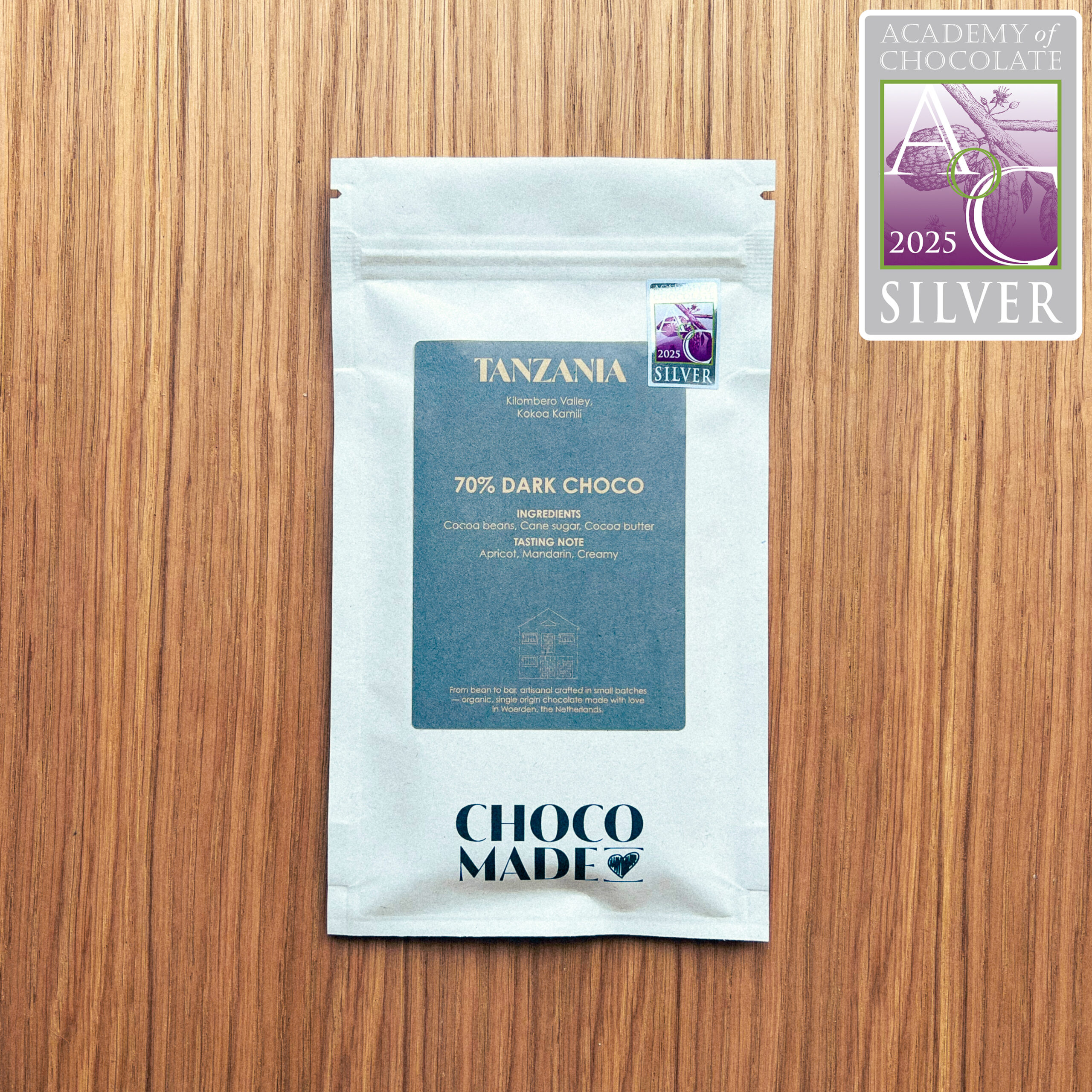 De cacao voor deze reep komt van Kokoa Kamille. Een organisatie gevestigd in de Kilombero Valley in Tanzania. De cacaobonen worden met precisie gebrand om het fruitige en romige karakter van de boon te behouden. Bij het concheren wordt het romige nog eens extra versterkt en verliezen we het ergste zuur van het fruitige karakter. Hierdoor ontstaat een heerlijke gebalanceerde romige choco reep met sterke tonen van Abrikoos en Mandarijn.