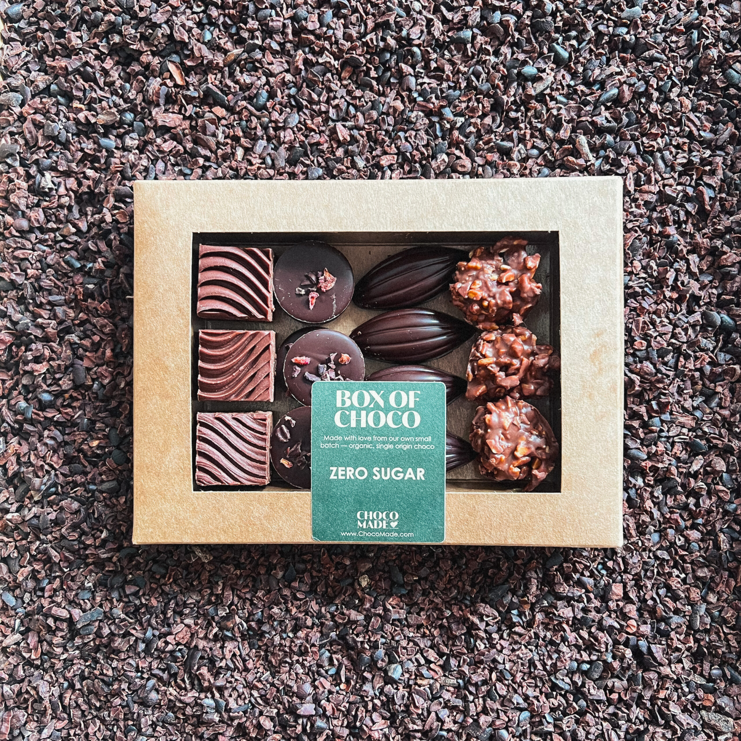 Maar als het in iedergeval geen suiker mag zijn, dan is dit doosje perfect voor jou! Een heerlijk assortiment gemaakt met onze eigen suikervrije chocolades. Want iedereen verdient een chocolade momentje!